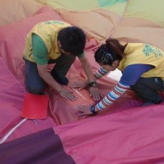 今朝、久しぶりに気球体験を実施しました。 うす曇りだったけど 北アルプスはバッチリ☆ 少人数でしたので のんびりとした朝でした。 体験終了後・・・ パイロットが修理しているところを発見。 気球自体は耐熱の布?なんです。 でも年々劣化しますので ときには修理も必要で。 今回はパックリ裂けたところを 直しました。 これでまた長持ちしますね。